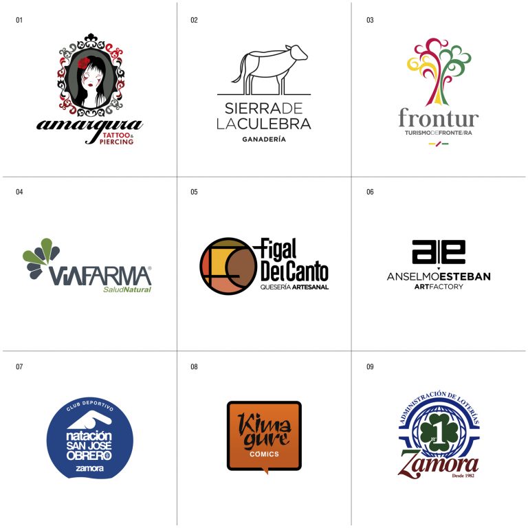 Conceptualización y diseño de marca para diversas empresas e instituciones:01 > Amargura Tattoo / 02 > Ganadería Sierra de la Culebra / 03 > Frontur Turismo de Frontera / 04 > Viafarma Salud Natural / 05 > Quesería Artesanal Figal Del Canto / 06 > Anselmo Esteban Art factory / 07 > Club Deportivo Natación San José Obrero / 08 > Kimagure Cómics / 09 > Administración de Loterías Número 1 de Zamora. 01, 02, 03 y 04 para Jaus Comunicación VOLVER